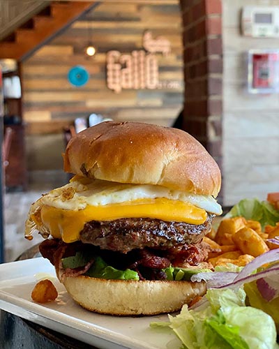 80/20 Fresh Blend Beef, Bacon, Lettuce, Tomatoes, Pickles, and Purple Onions with Avocado and a Sunny Side Up Egg on a Brioche Bun