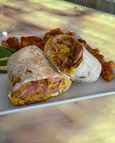 Chorizo or Carne Asada or Vegetable with Eggs, Shredded Cheese, Yellow Rice, and Beans with Avocado and Fried Potatoes